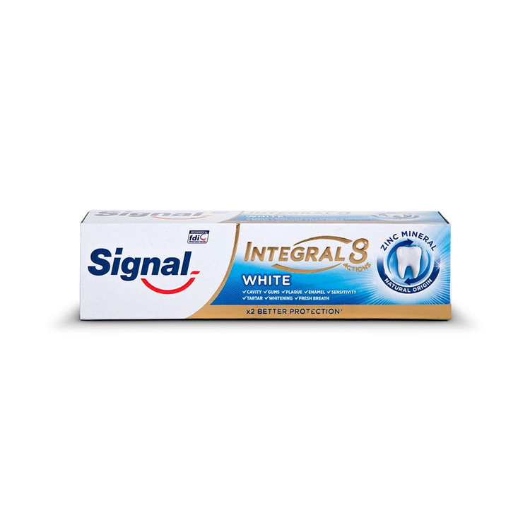 سفیدی دندان نشانهی سلامت دندانها است و چهره را جوانتر نشان میدهد. محور عملکرد خمیردندان اینتگرال 8 سیگنال مدل White، سفیدی و درخشندگی دندان است. علاوه بر تاثیرات مراقبتی، این محصول ویژه از Unilever پلاک و تارتار موجود را میزداید. در نهایت با سفیدتر کردن دندان از رنگ طبیعیاش، باعث زیباتر شدن لبخند میشود.