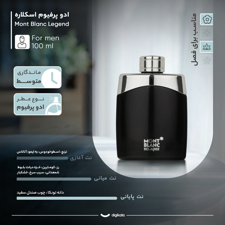 ادو پرفیوم مردانه اسکلاره مدل مونت بلانک لجند محصول جدید از شرکت اسکلاره است.عطری است شاداب و میوه ای برای آقایان که با رایحه شیرین و دوست داشتنی آناناس آغاز میشود که حضور رایحه اسطوخدوس در کنارش حسی تمیز و خنک به آن داده و شاداب بودن عطر را افزایش میدهد. رایحه Mont Blanc Legend در مجموع خطی بوده و تغییرات زیادی ندارد و با گذر زمان تنها کمی شیرینتر میشود. مونت بلنک لجند پخش بوی متوسط و ماندگاری مناسبی دارد و انتخاب بسیار خوبی است برای مصرف روزانه در بهار و تابستان.با اولین اسپری مونت بلنک لجند بوی اسطوخودوس، آناناس و نارنج بهسرعت در فضای اطراف شما پخش میشود. شادی و سرزندگی عجیبی که از این مخلوط سهگانه میگیرید، به اطرافیان شما هم منتقل میشود. پس از کمی آرامآرام، بوی گل رز و شمعدانی، سیب، خزه و میوههای خشک جایگزین نتهای قبلی میشود. این عناصر خنکی و شیرینی مطلوبی ایجاد میکنند. با گذشت زمانی از اسپری، رایحههای دانهی تونکا و چوب صندل برای ماندگاری بیشتر لجند روی محل نبض یا لباس شما وارد عمل میشوند.