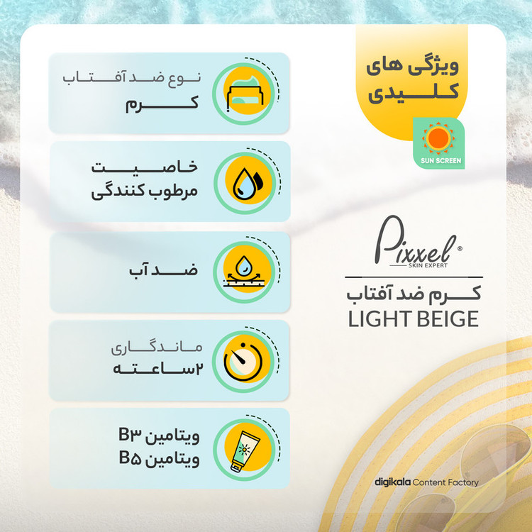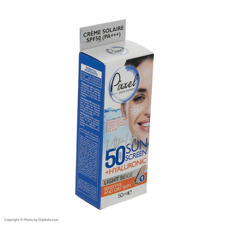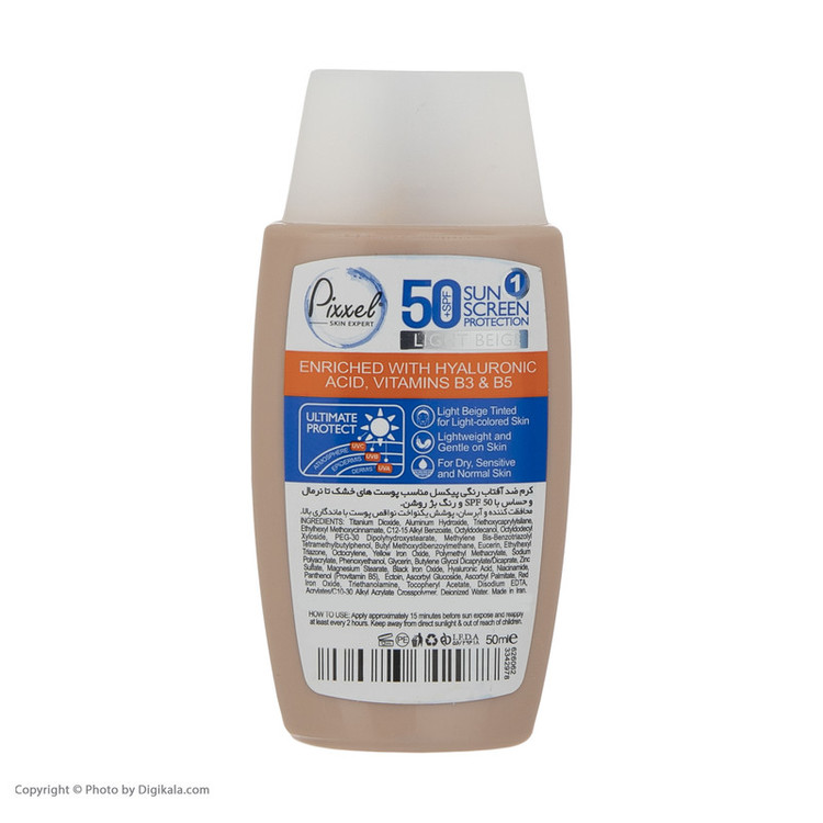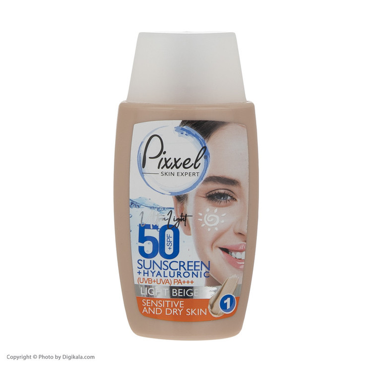 کرم ضد آفتاب رنگی پیکسل SPF50 مدل LIGHT BEIGE محافظ UVA ،UVB و +++PA، مرطوبکننده، مناسب پوستهای حساس و خشک حجم 50 میلیلیتر