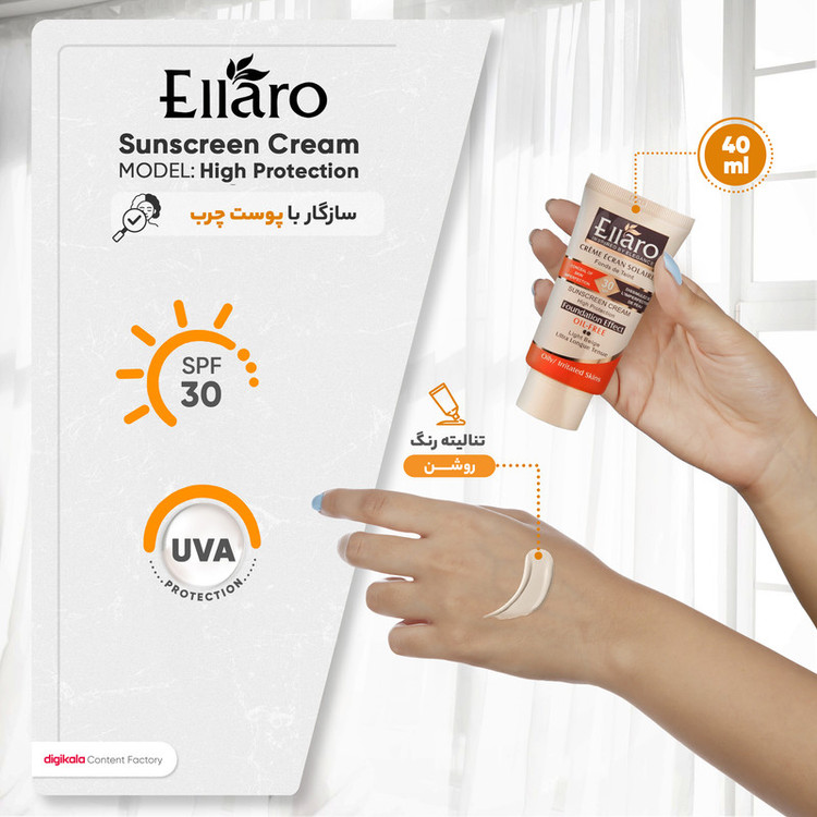مدل «Haute Protection» کرم ضدآفتاب برند «الارو» (Ellaro) سری «Foundation Effect» همانطور که از نامش پیداست دارای اثر کرمپودری است که میتواند هم از پوستتان در برابر اشعههای مضر نور خورشید محافظت کند و هم کاربردی مشابه کرمپودر و آرایشی داشته باشد. رنگ کرم الارو بژ روشن است که برای افرادی که پوستی روشن و حتی گندمی دارند مناسب خواهد بود. ماندگاری ضدآفتاب کرمپودری الارو بالا است و این کرم فاقد پارابن و چربی است و استفاده از آن به افرادی که پوستهای چرب و مستعد جوش دارند توصیه میشود. الارو با دارا بودن SPF30 از پوست صورت در برابر اشعههای UVA و UVB محافظت میکند و مانع از آفتاب سوختگی پوست میشود. SPF30 میزان تقریباً ضعیفی نسبتبه SPFهای بالاتر محسوب میشود و بهتر است افرادی که پوست خیلی حساسی نسبتبه آفتاب ندارند از این SPF استفاده کنند. ضدآفتابهای الارو از نوع کرمپودری و معمولی در حجمها و SPFهای مختلف وجود دارند که از کیفیت بالایی برخوردارند و شما میتوانید نوعی که با پوستتان سازگارتر است را مورداستفاده قرار دهید. حجم کرم ضدآفتاب الارو چهل میلیلیتر است که در تیوپی پلاستیکی گنجانده شده است. کرم الارو دوکاره است و با کیفیت و قیمت مناسبی که دارند یک انتخاب عالی برای خانمها خواهد بود.
