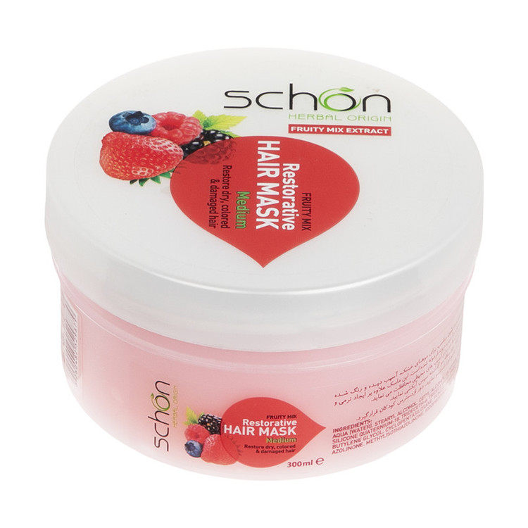 ماسک موی کاسه ای میوه ای فروتی میکس شون رطوبت مورد نیاز برای موها را تامین کرده و با ترمیم موهای ضعیف، درخشش و لطافت را به بافت موها باز میگرداند. این محصول به دلیل برخورداری از عصاره میوههای قرمز که منبع آنتی اکسیدان هستند، از فعالیت رادیکالهای آزاد بر روی پوست و موی سر جلوگیری کرده و از این رو گزینهای مناسب برای موهای نرمال، رنگ شده و آسیب دیده به شمار میرود.