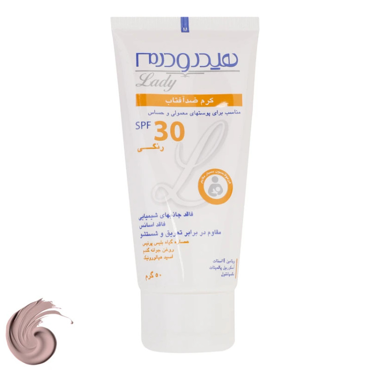 کرم ضدآفتاب رنگی هیدرودرم مدل SPF30، مناسب پوستهای معمولی و حساس، حجم 50 میلیلیتر