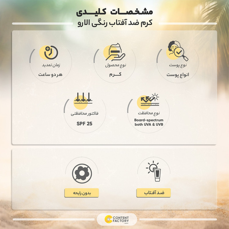 کرم ضدآفتاب الارو، با تنالیته رنگ متوسط و با فرمولاسیونی منحصربهفرد، انتخابی ایدهآل برای بانوانی است که به دنبال محافظت کامل از پوست صورت خود در برابر اشعههای مضر خورشید هستند. این کرم با SPF 25 به طور مؤثر از پوست در برابر اشعههای UVA و UVB محافظت میکند و با رنگ ملایم خود، جلوهای طبیعی و زیبا به پوست میبخشد. با حجم 40 میلیلیتر، این محصول مناسب برای همه انواع پوستها طراحی شده و به راحتی بر روی پوست پخش میشود، بدون اینکه احساس سنگینی یا چربی روی پوست ایجاد کند. الارو با این کرم ضدآفتاب، تجربهای از محافظت و زیبایی را همزمان به شما ارائه میدهد. این محصول با ماندگاری دو ساعته خود، برای استفاده روزانه ایدهآل است و میتواند به عنوان پایهای مناسب برای آرایش روزانه شما عمل کند. ویژگی ظاهری رنگی آن، علاوه بر محافظت از پوست، به شما کمک میکند تا به راحتی نقاطی که نیاز به پوشش دارند را ببینید و با یکدست کردن رنگ پوست، جلوهای طبیعی به آن ببخشید. این ضدآفتاب، بهترین انتخاب برای بانوانی است که به دنبال ترکیبی از زیبایی و محافظت هستند.