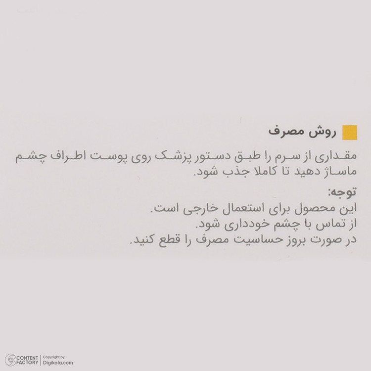 مقداری از سرم را روی پوست دور اطراف چشم ماساژ دهید تا کاملاٌ جذب شود .