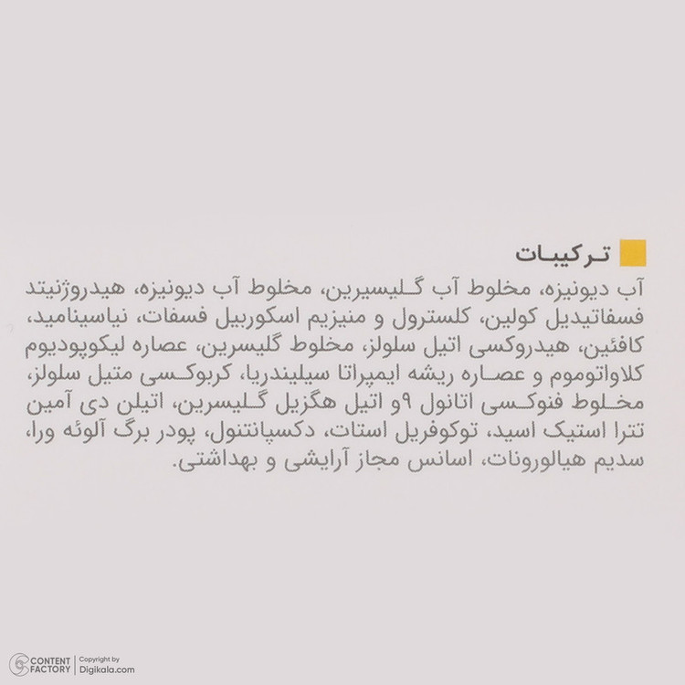 آب دیونیزه، مخلوط آب گلیسرین، مخلوط آب دیونیزه، هیدروژنیتد فسفاتیدیل کولین، کلسترول و منیزیم آسکوربیل فسفات، نیاسین آمید، کافئین، هیدروکسی اتیل سلولز، مخلوط گلیسرین، عصاره لیکوپودیوم کلاواتوموم و عصاره ریشه ایمپراتا سیلیندریا، کربوکسی متیل سلولز، مخلوط فنوکسی اتانول 9 و اتیل هگزیل گلیسرین، اتیلن دی آمین تترا استیک اسید، توکوفریل استات، دکسپانتنول، پودر برگ آلوئه ورا، سدیم هیالورونات، اسانس مجاز آرایشی و بهداشتی.
