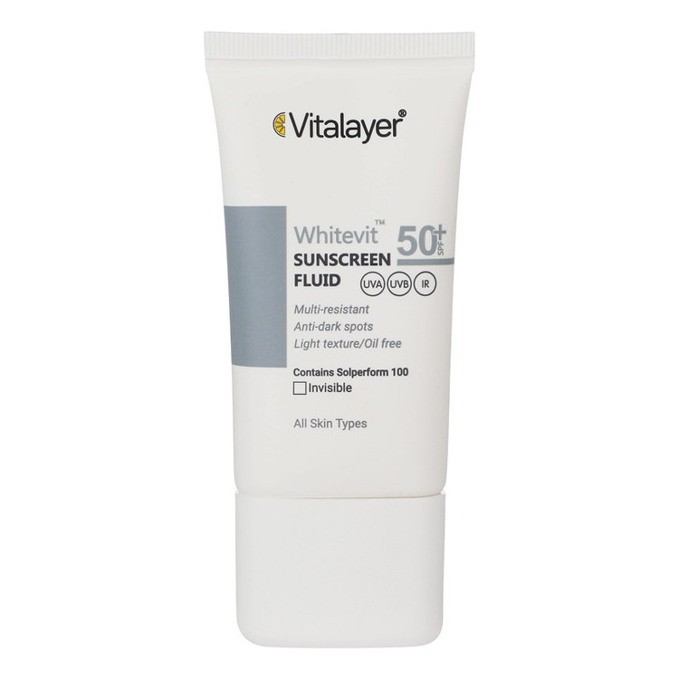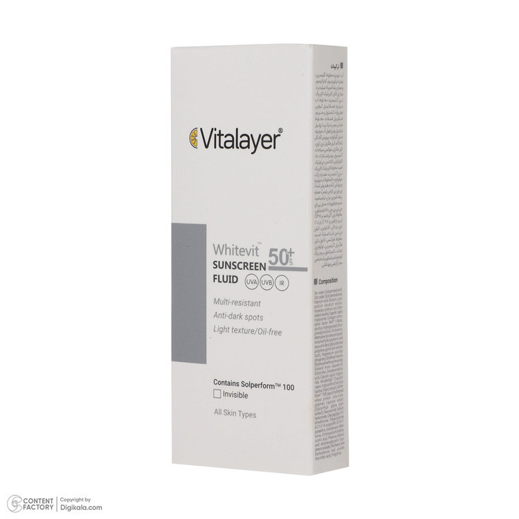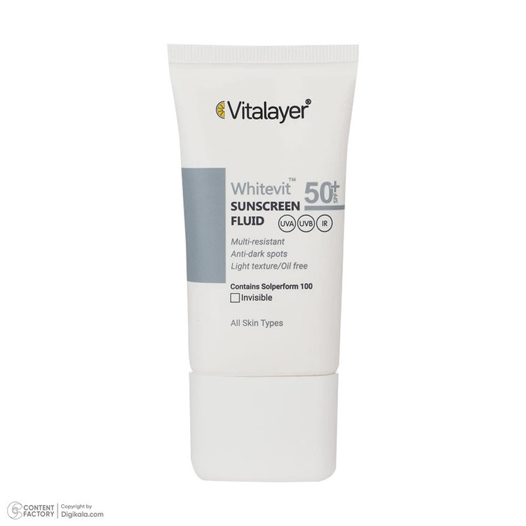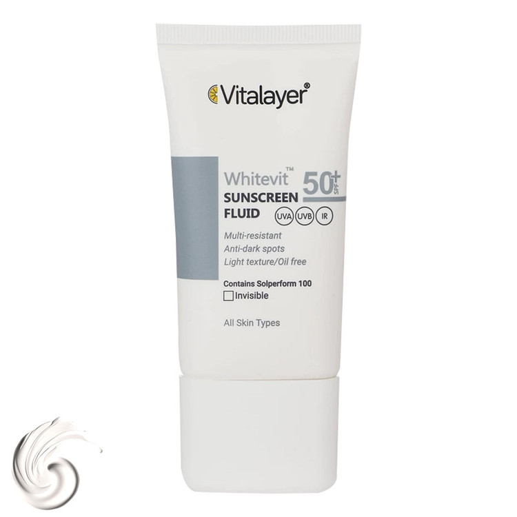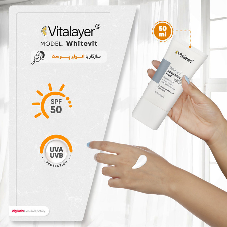 فلوئید ضد آفتاب بدون رنگ ویتالیر SPF50 مدل Whitevit محافظ UVA ،UVB، ضد آب، ضد لک، مناسب انواع پوست حجم 50 میلیلیتر