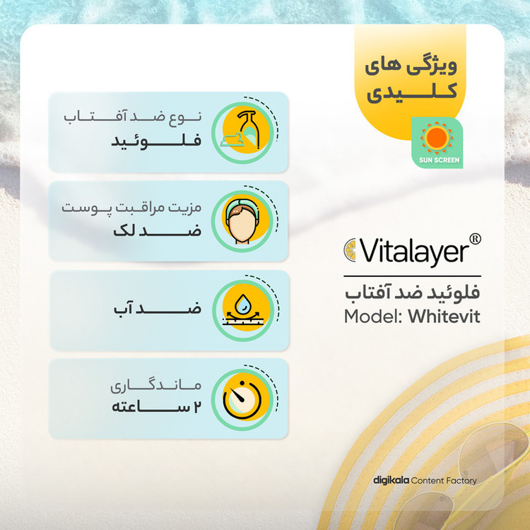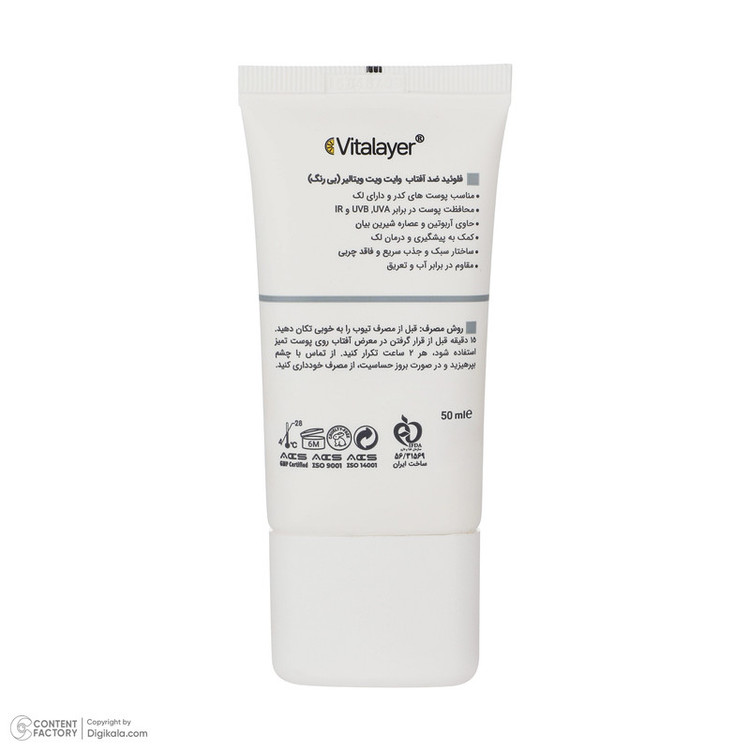 فلوئید ضدآفتاب بی رنگ ویتالیر SPF 50 مدل Whitevit، با حجم 50 میلی لیتر، یک محصول بسیار کارآمد و مناسب برای انواع پوست است. این فلوئید ضدآفتاب حاوی ویژگیهای محافظتکننده در برابر اشعههای UVA و UVB میباشد. با شماره مجوز 56/31569 تایید شده و سازگاری با انواع پوستها، این محصول مناسب برای بانوان و آقایان است. راهنمای استفاده از این فلوئید ضدآفتاب عبارت است از: قبل از استفاده، به خوبی فلوئید را تکان دهید. حداقل 15 دقیقه قبل از قرار گرفتن در معرض آفتاب، فلوئید را روی پوست تمیز بمالید. هر دو ساعت یکبار مجدداً از فلوئید استفاده و تمدید کنید. از تماس با چشم خودداری کرده و در صورت بروز حساسیت، از استفاده خودداری نمایید. این فلوئید ضدآفتاب، با ویژگیهای محافظتکننده در برابر اشعههای UVA و UVB، امکان محافظت کامل از پوست شما در مقابل اثرات مضر نور خورشید را فراهم میکند. وزن این محصول 55 گرم بوده و برای استفاده روزانه بر روی پوست، مناسب و کارآمد است. با استفاده منظم از این فلوئید ضدآفتاب، میتوانید از مزایای حفاظتی و محافظتی این محصول در برابر اشعههای خطرناک آفتاب بهرهمند شوید و پوست سالم و محافظت شدهای داشته باشید. انتخاب این محصول، قدمی مهم در مراقبت از پوست و حفاظت آن از عوامل خارجی مضر است.