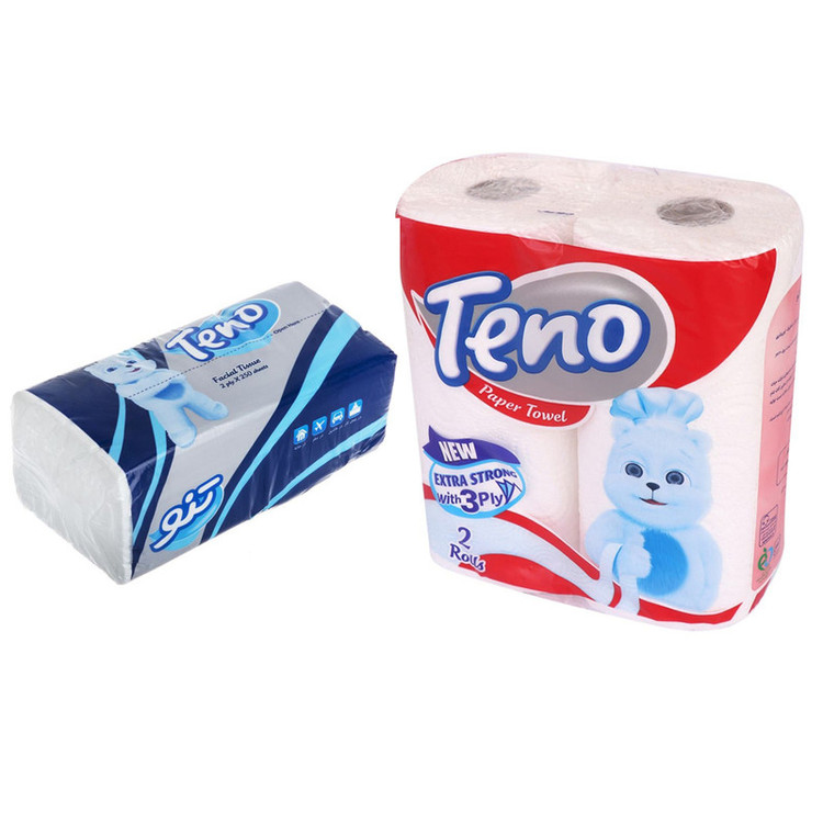 این محصول در مجموع شامل یک بسته 2 عددی دستمال حوله ای و یک عدد دستمال کاغذی رومیزی 250 برگ تنو است.