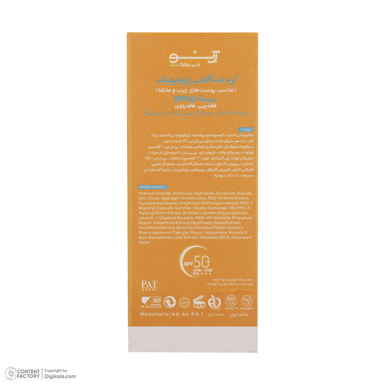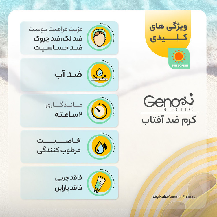 ویژگیهای ضدآفتاب : ضد آب , محافظت کننده در برابر اشعه UVA , محافظت کننده در برابر اشعه UVB , ضد حساسیت , غیر کومدون زا , مرطوب کننده , فاقد پارابن
