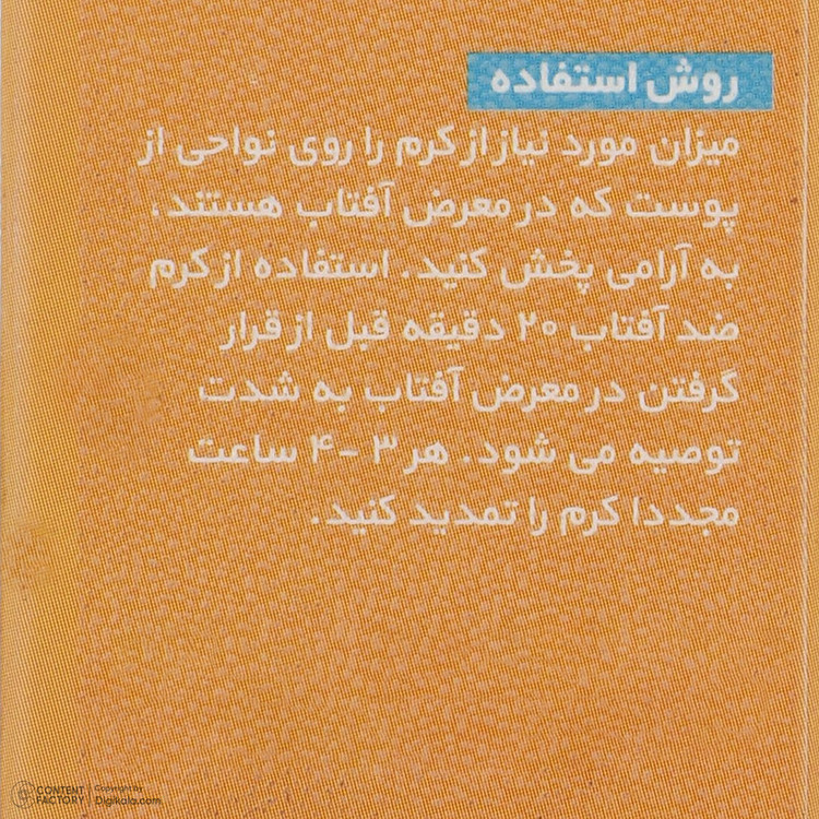 راهنمای استفاده : 20 دقیقه قبل از قرار گرفتن در معرض آفتاب استفاده نموده و هر 3-4 ساعت یکبار آن را تجدید نمایید.