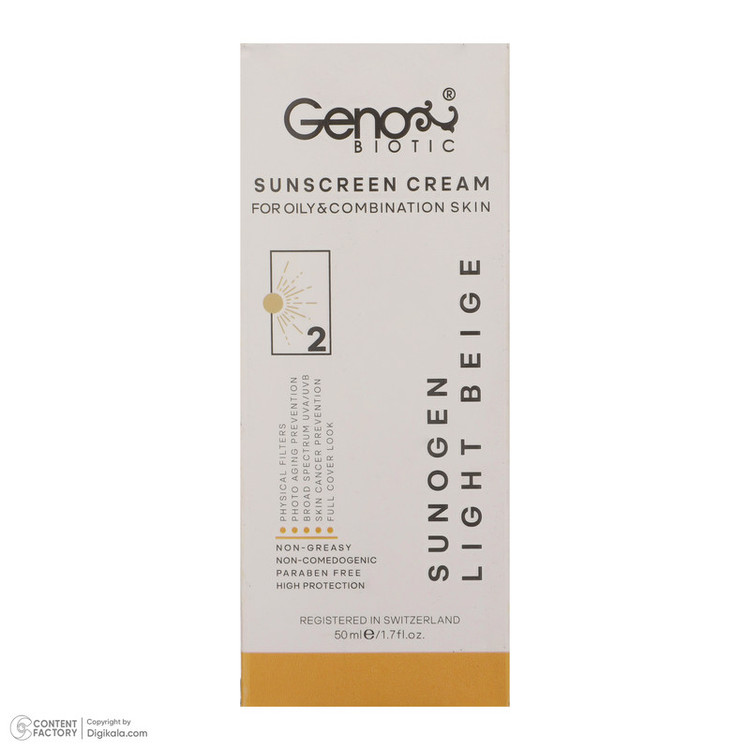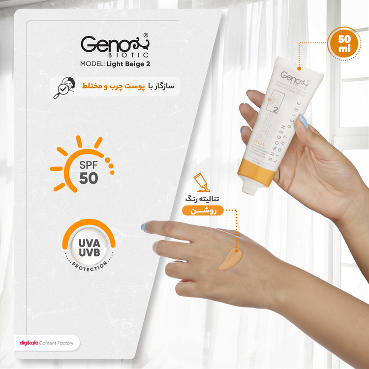 کرم ضدآفتاب رنگی ژنوبایوتیک با SPF 50 و PA+++، یک محصول چند منظوره است که با ترکیبات غنی خود، محافظت کاملی از پوست در برابر آفتاب ارائه میدهد. این کرم با بافت سبک و بدون رنگ خود، برای انواع پوستها مناسب است و به راحتی جذب میشود. ویتامینهای E و C در ترکیب این کرم، به تغذیه و مرطوبکردن پوست کمک میکنند و از خشکی و پیری زودرس جلوگیری مینمایند. این کرم با ماندگاری 2 ساعته، محافظت روزانه قابل اعتمادی را فراهم میکند. بافت سبک و جذب سریع این کرم، احساس راحتی و تازگی به پوست میدهد و بدون ایجاد حس چسبندگی یا سنگینی، میتواند به عنوان یک پایه آرایشی نیز مورد استفاده قرار گیرد. این کرم با ویژگیهای ضد چروک و روشنکننده، به حفظ جوانی و شادابی پوست کمک میکند. استفاده از این کرم، از پیری زودرس و آسیبهای ناشی از نور خورشید جلوگیری کرده و پوستی سالم و زیبا را به ارمغان میآورد. این محصول بهویژه برای بانوان طراحی شده و نیاز به استفاده از کرم پودر را کاهش میدهد.